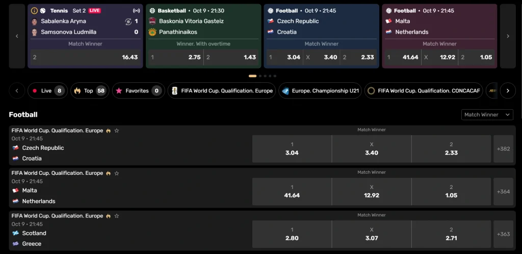 • Baloncesto y Tenis: Cubrimos las principales ligas y torneos, incluyendo la NBA, la Euroliga y todos los Grand Slams. Te ofrecemos una amplia variedad de mercados, desde la línea de dinero y los hándicaps hasta apuestas en vivo que cambian dinámicamente con el juego.